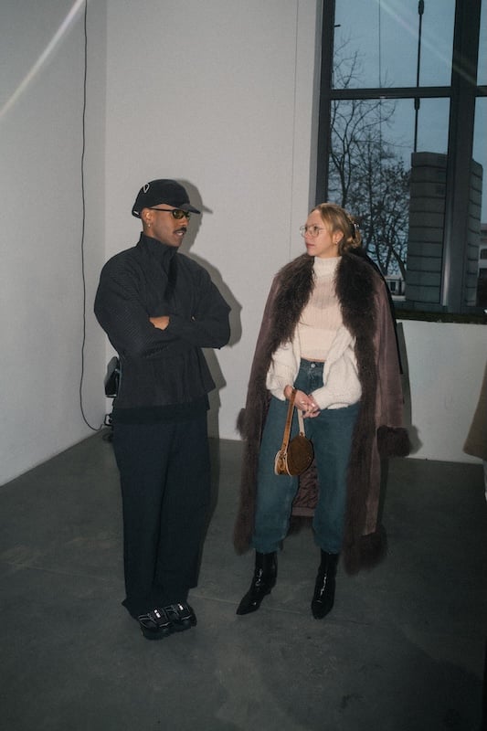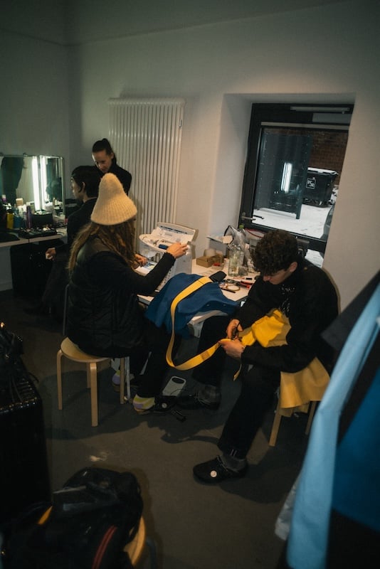 Unsere Arbeit vor Ort begann wenige Stunden vor eigentlichem Start der Show. Überall Kleiderständer, Models in letzten Fittings, es wird gebürstet, geschruppt, letzte Details im Set Design gesetzt. Ein Runway Event ist bereits eine Produktion für sich, wir kommen an und setzen eine zweite obendrauf. Niemand darf den jeweils anderen behindern oder aufhalten und Abläufe müssen sich nahtlos ineinander integrieren. Um die geforderten Social Media Assets von Gästen, Set und Models einzufangen, bewegten wir uns also so fließend und unauffällig wie möglich durch die Halle und wurden eins mit dem Getümmel.